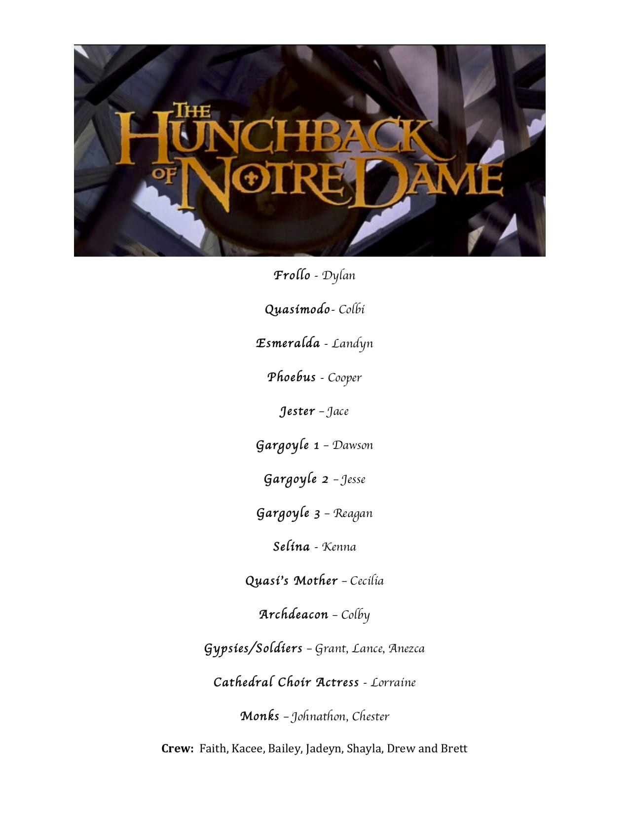 Congratulations to the following students on being cast in the 2019 One Act Play titled “The Hunchback of Notre Dame.”