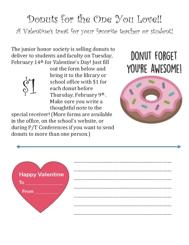 Donuts for the One You Love. The junior honor society is selling donuts to deliver to students and faculty on Tuesday, February 14th for Valentine’s Day! Just download and fill out the form below and bring it to the library or school office with $1 for each donut. Please bring before Thursday, February 9th so we can order. Make sure you write a thoughtful note to the special receiver! (More forms are available in the office or you can print more by clicking Donuts for the One You Love. We will also have them available at Parent-Teacher Conferences.